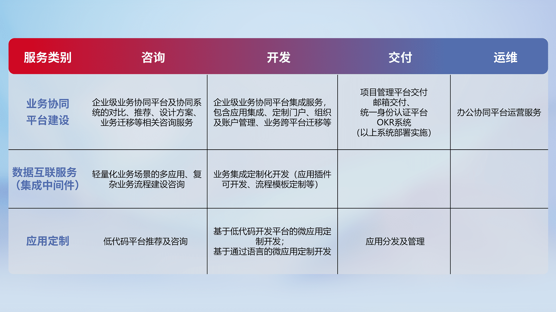 针对钉钉、、、企微、、、IDaas等平台级产品提供产品的规划、、、、方案、、、交付、、定制化开发等服务,,实现如统一协同办公、、、、智能客户服务、、、、混合会议管理、、、智能数据查询、、、、等业务场景,,,实现数字化转型。。