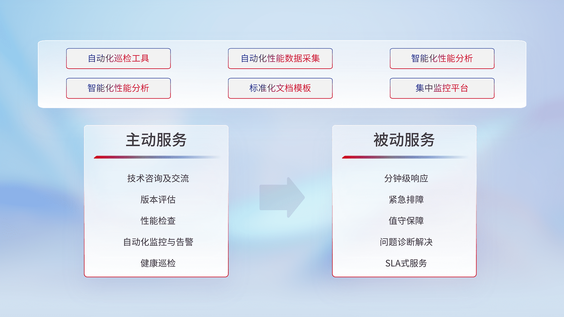 智能化工具和标准化文档,,保障服务质量,,,,提供主动服务(包含技术咨询、、版本评估、、、、性能检查、、、自动化监控与告警、、、健康巡检)和被动服务包含(分钟级响应、、、紧急排障、、值守保障、、、问题诊断解决、、、SLA服务)。。